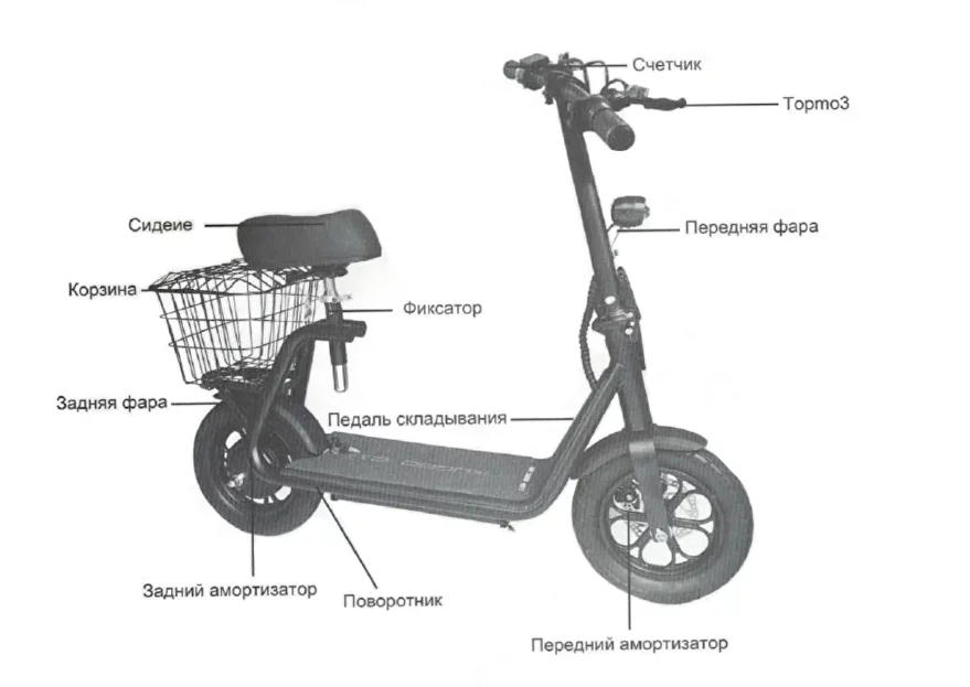 Комплектация: зарядное устройство, сиденье, корзина, инструкция, гарантия 1 год