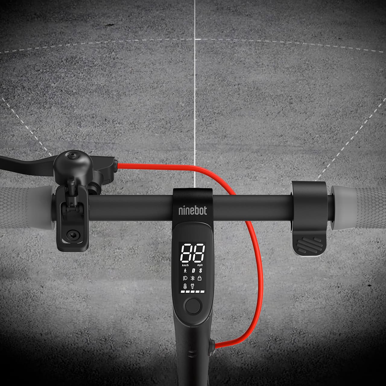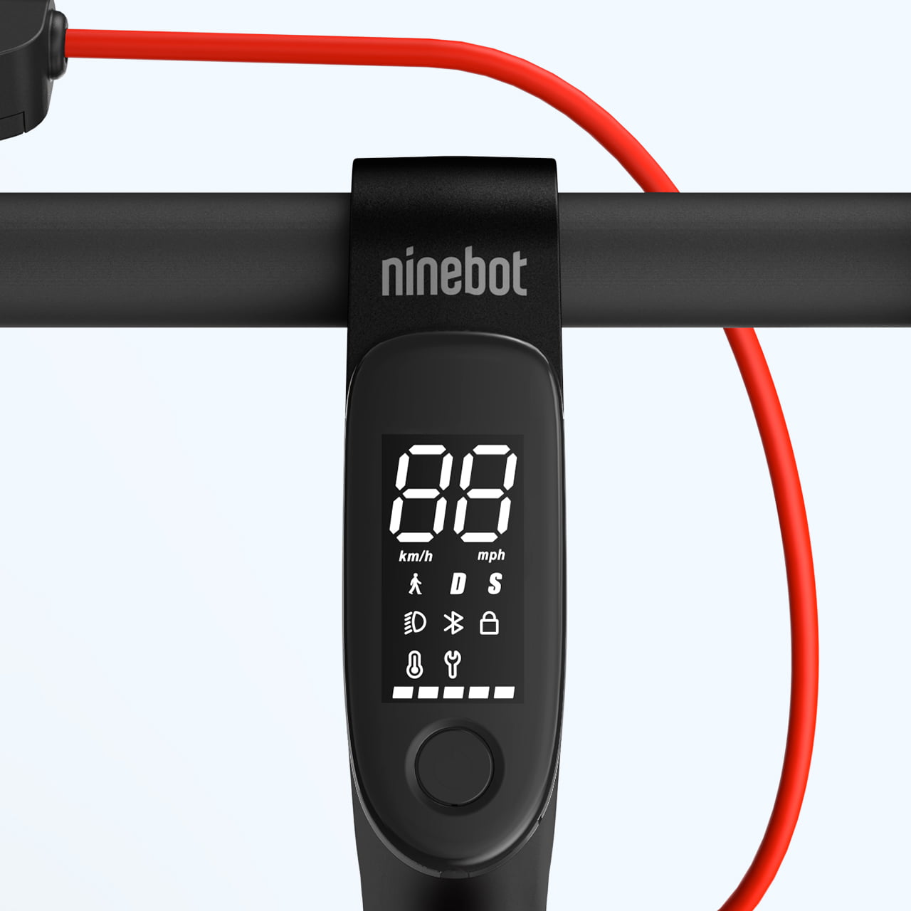 На LED-дисплее отображается вся необходимая информация: выбранный режим движения, текущая скорость, уровень заряда аккумулятора, индикация включённой фары и bluetooth-модуля, а также сервисные сообщения – всё это всегда на виду. Ninebot D38 традиционно имеет три режима движения: Eco – с ограничением скорости до 15 км\ч, Drive – без ограничений, и Sport – в котором самокат быстрее набирает скорость. Также имеется дополнительный "Режим пешехода" – при его активации скорость ограничивается 5 км\ч и самокат можно катить рядом с собой.